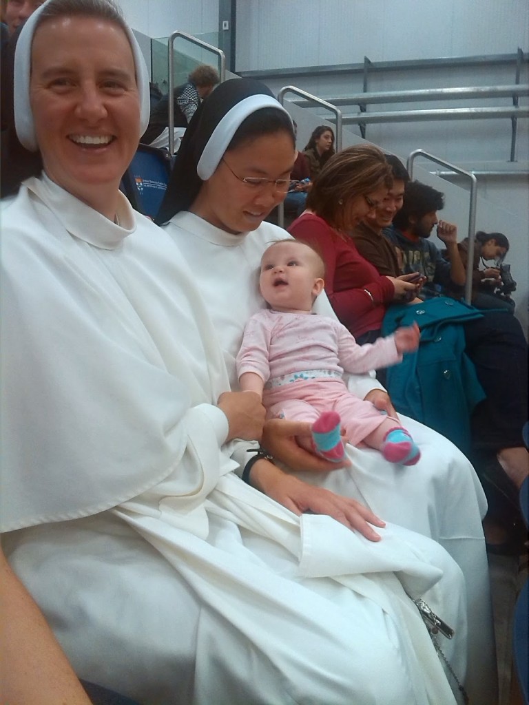 Leave you with a photo peek of yesterday. Bella sitting on the lap of the Dominican Sisters (from Tennesee) who turned up to cheer at the Cardinals Cup. Sr Mary R had just been in Rome for the cannonization so I got to hear about that too:)