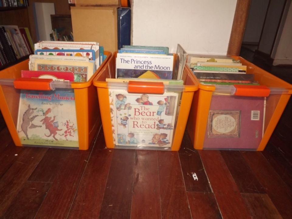 Last week I took advantage of the 40% off sale at Target on storage items. I was thrilled to buy all manner of containers including several of these beauties to house our picture book collection.  So easy to tote our ‘theme of the week’ from library to learning room this way.  Really made my week.