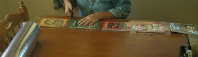 I buy ‘clear gloss premium PVC plastic’ on a huge rolls of 100m lengths. You can purchase smaller rolls than this. Contact your state’s library suppliers to see what they have available (your local library should be able to give you contact details). Do not be tempted to buy a cheaper product, I’ve friends who have done so and regretted it, it is far harder to work with and the result is not as good.