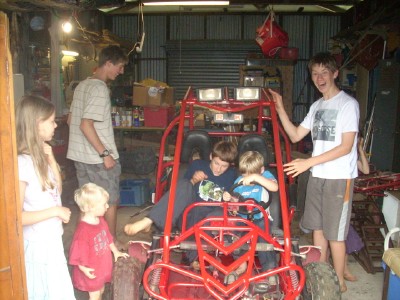 PC and Koala (who had helped Dad pick up the buggy and was in on the secret,) scraped and sanded back all the rust late into each night in the week preceding Christmas. Then PC spray painted with Kill Rust. We won’t be doing this job again anytime soon. The seats were washed of mud and accessories cleaned up.