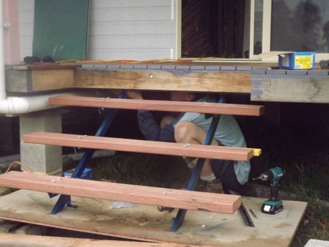 Every night last week, until all hours PC has been tinkering in the shed, welding, grinding and painting. His latest undertaking has been designing and welding stair frames. His first welding project in years, I confess to being rather impressed.